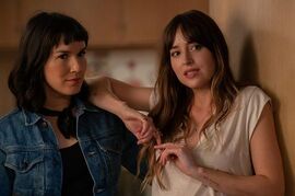 女主达科塔·约翰逊因《五十度灰》三部曲而被世人所知,她方方面面本没什么大亮点,容貌也不算大美女,但因出演饱受争议的《五十度灰》三部曲而大胆搏出位,打开了演艺之路。值得一提的是,科塔·约翰逊在本片中的发型仍是常见刘海造型,因其有个发际线后移的难看大圆额头,在无刘海的《阴风阵阵》中暴露无遗。