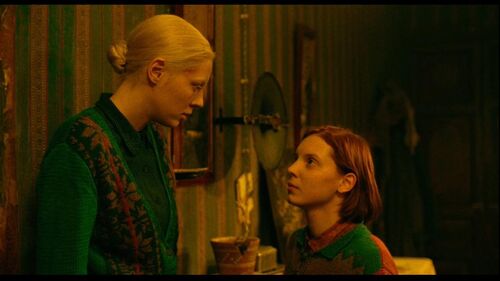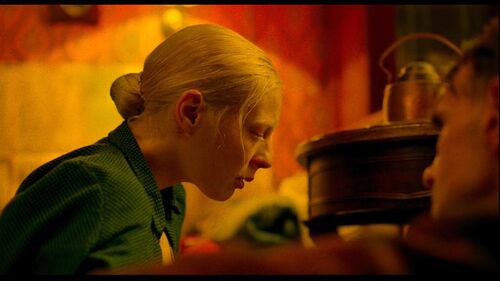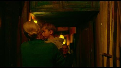 电影如同巴拉戈夫一鸣惊人的处女作《狭隘》一般,仍然不吝以最浓郁饱和的色彩来对人物关系进行赋义,红与绿的对撞毫不减损整体画面的美感。两种颜色在衣饰和环境中穿插渗透,在无声中形成对话。