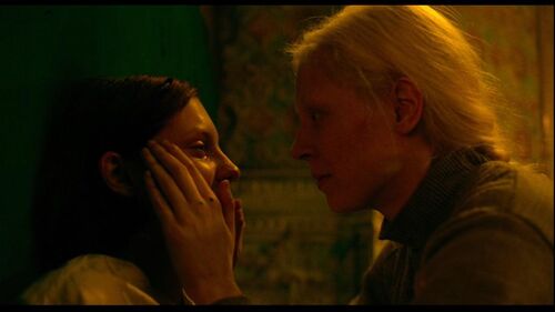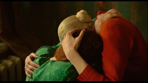 上面的吻戏片段中,墙壁上未干的绿色油漆被拥抱又推搡的二人不小心蹭在脸上、身上,似乎昭示着什么。绿色的墙漆在背景中呈现蔓延之势,玛莎与伊娅二人固有的色彩属性也发生改变,衣着的红与绿逐渐交织,不分彼此。