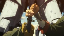说到服装,“火星”这个舞台最早给千叶老师的感觉是很冷的,所以给她穿上了蓬蓬的卫衣。然而铁华团的成员在战斗的时候反而是半裸上阵。相信“半裸上阵”也是不少观众关注的焦点。说到这里,千叶老师特别提到了一部作品——《阿帕奇棒球军》,就像他们那样以裸体为制服的感觉(笑),在作画的时候要特别意识到不能像时下的一些动画把肌肉画得特别光滑透亮,也不能画得古老臭。作画方面,相对制服来说虽然要更加复杂,费功夫,但好在组里喜欢画肌肉的原画师还是不少的,因此就完全交给他们去发挥。要体现出爽朗的一面,不能只从他们的肌肉上表现,还有一个非常直观的表现就是发型。铁华团这一水的短毛更是千叶老师近年来担当人设的作品中非常少见的,他个人也乐在其中。