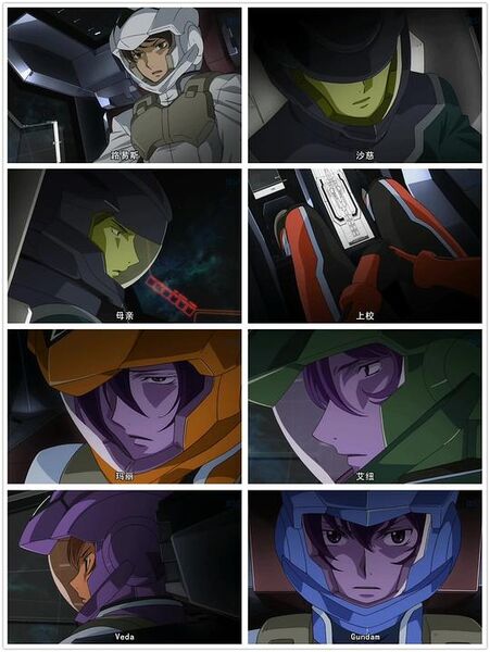 可是对于Setsuna自己来说,对于所有Gundam机师来说,从认清了这个世界的事实开始,从站在属于自己的Gundam面前开始,前方的道路就已没有选择。失去了所有亲人的Lockon在恐怖分子袭击后的废墟上痛苦茫然,在宇宙中无望漂流的Allelujah因为自己的合成脑电波痛苦疯狂,年幼的Setsuna被迫拿着武器为了那个不存在的真主在战场废墟间痛苦狂奔……曾经绝望过的心灵,曾经枯竭过的泪水,只有在成为Gundam机师后,那份久违的执着和信念才被唤醒。于是,他们肩负着沉重的使命踏上了战斗的征途,去实践舒恩伯格200年前的那个看似不可能实现的理想。只是,现实的残酷根本不是这些被美好未来的幻想所激励的少年们所能想象的。所以会被误解,会被利用,会被欺骗,会被抛弃。但即使痛苦,即使悲伤,为了勉强支撑的脆弱理想,他们依然在战斗。