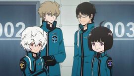 作者设计的主角团同样也是这部作品有趣、并且吸引特定观众的原因。作为第一主角的三云修(昵称阿修),战斗实在是太弱了。甚至到了会让那些喜欢看开挂式主角的观众们破口大骂的地步了。阿修的三离子量(Trion量,又被翻译为触力能相当于魔法值或者查克拉)弱到当初连边境(守卫地球的组织)都不想收留他。而他的同伴雨取千佳(昵称千佳(酱))三离子量虽然多到不可思议,在战斗中却不敢攻击敌人。唯一具有强力攻击力的空闲游真(昵称空闲、游真)则是他们队唯一能够正常战斗的王牌。你乍一听,不知道可能的还会以为是《为这个美好的世界送上祝福》的姐妹版。