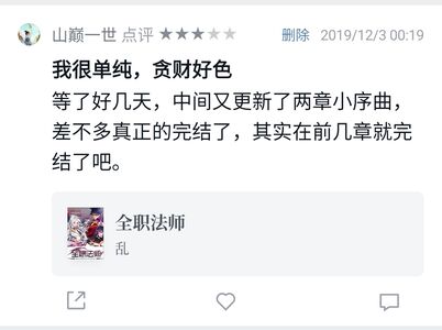 【忘了何时开始看了】【20191203完】【小说】等了好几天,中间又更新了两章小序曲,差不多真正的完结了,其实在前几章就完结了吧。追更到澜阳副本的时候无聊二刷了一波,看得很慢一直在想要不要整理下整本书的脉络,方便完结时好好写点东西。可是也一直没有动手,不料一拖就拖到完结了。但是于情于理,都不应该这么早完结啊。但是也算是情理之外,意料之中。毕竟一个 IP 起来了,下一本开始续集魔法宇宙,源源不断才有收入嘛!更多的是遗憾吧,完结的太仓促太着急了,因为下一本估计就没有这个热情看下去了。乱太乱来了,又要挖新坑了。挖坑不填,小心长眠啊。接下来聊聊这本书吧,之前大都是在网页追的更,后来开始在QQ阅读看正版,大概从2500章左右转到微信读书,到完结六七百章中留下了三百多条的笔记,现在也当是做个总结吧,想到什么说什么吧,不完美的结局已经不值得再花费大量时间来梳理内容了。其实我在之前就一直多次担心烂尾:t• 乱叔呀,最近这节奏有点快呀,有点跟不上呀,我嗅到了烂尾的节奏了,你是不是急着出新书了?别着急啊,再写它个三五年呀!t• 这一章到现在看得迷迷糊糊,估计乱也是蒙了。t 1.设定模糊,乃至忘记。t 2.强行解释,最为致命。t 3.幸福来得突然,在小说前期是个振奋人心的消息,越靠近完结越是烂尾的节奏。tt所以,我是不是该准备刀片了!