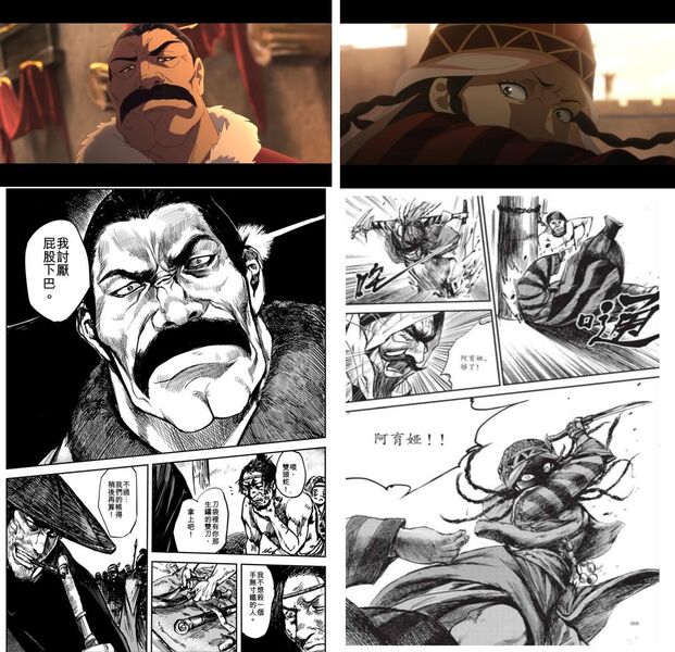 在观看的时候曾经多次期待能出现飞碟桌级别、哪怕骨头社品质的武斗演出,实则相见形拙。动作衔接的断帧和运镜凌乱咬咬牙忍了、角色时常PPT化导致表情和台词情绪的割裂我也忍了,但角色的面部设计几乎没有达到许先哲原作的神韵和沧桑感,以及整体过于干净的画面和光影呈现实在是有点儿忍不了,一言蔽之,动画对原作的情绪理解和演出的力量感上,差太多了。归根结底,面瘫脸和动作简陋的罪魁祸首都是成本,但作画的神韵不到就是尊重和理解的问题了。