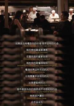 当然,席琳·宋的算计和扼杀不止于此,她计算着把哪个角色放在哪,才能最大程度地挑动情绪:把她放在强奸犯面前、把他放在人家门口一晚上。别忘了道格拉斯·塞克所说的“motion is emotion”——在记录Motion的motion picture里,限制运动即是扼杀感情。注意:非你所动,便永不挪移的,唯有象棋的棋子——它们不是真人,只是植入了膨体的面孔们,以一种非常物质主义(肤浅的同义词)的方式,不断互相确认、盘问:身高多少、要求什么、他年薪多少、她年龄多大、我能得到什么。可是,没人提出真正重要的问题: