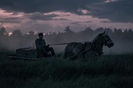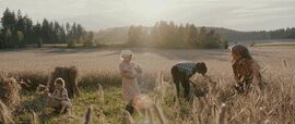 当他终于有假期回家照顾妻儿时,还不忘一起收割家中田地里的黑麦,而这一幕是全片少有的暖色调的温馨画面。