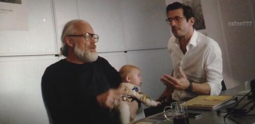 2、Christian请的外宣团队来博物馆开会商讨《魔方》的宣传方案。值得一提是,一个画风奇特的老男人出现在会议上。在Christian的团队里,有一个五十多岁的男人,拎着一个吃奶嘴的婴儿一起上班和开会。这个画面在电影里被多次强调。没错,这是典型的自由、开放、平权的象征,还会让人艳羡艺术家的浪漫——“艺术家”的身份往往会掩盖一切不合理,就像在艺术馆里,面对金箔和废纸,我们会一视同仁。