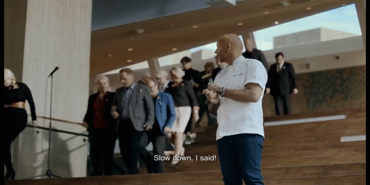 3、第一个和艺术有关的“车祸”是在接下来的展览开幕酒会上,Christian发表完激动人心的人演讲之后,请出大厨介绍菜品,可是并没有人想听,艺术界的高端宾客纷纷涌向餐厅。茫然无措的厨师忽然大吼一声喝住人群,随即讲完菜品介绍。