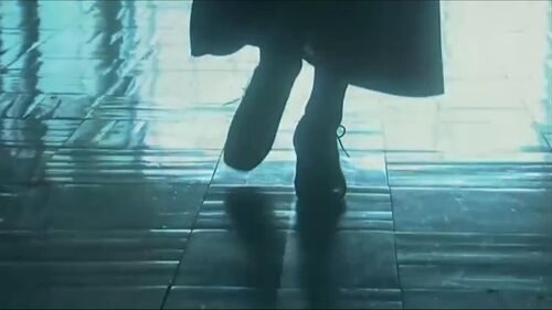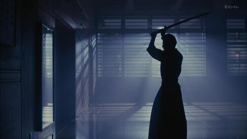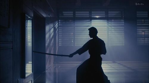 第二处印象深刻的镜头语言依旧是关于风间。第一集结尾由报纸上风间的面部特写到剑道馆风间的面部特写,此处是一个简单的蒙太奇转场(相似物转场),这种衔接自然过渡到下一个小故事,而后深蓝色调的剪影拍摄不仅突出了风间当下坚韧孤注的人物形象,同时也增加了剧情悬疑的因素,铺垫了之后情节的氛围。