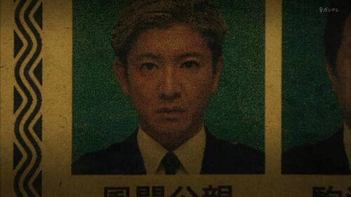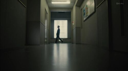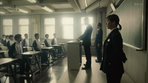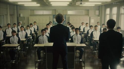 拍摄到这里,主角人物的神秘性已经不言而喻,进入教室后,风间上台自我介绍前,虚焦 背后全景推镜头再次增强人物的悬疑,直到风间的面部特写说出:"我叫风间公亲。"至此,全剧灵魂人物的出场介绍架构完成。
