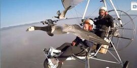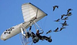 他决定就从小白额雁开始实验,他驾着超轻飞机飞到迁徙的雁群中间,向让这些雁跟着自己飞,飞一条更顺畅的路线。