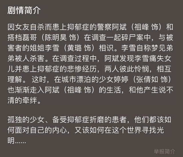警察阿斌因女友自杀而患上抑郁症,在与搭档磊哥调查一起碎尸案时,结识了被害者的姐姐李雪。李雪自称梦见弟弟被人杀害,她的悲惨遭遇和阿斌的内心创伤让两人相互理解并产生共鸣。与此同时,孤独的少女婷婷逐渐走入阿斌的生活,与他产生了复杂的情感牵绊。在案件调查中,阿斌不断挣扎于真相与内心的黑暗之间,而李雪也在努力面对失去女儿的痛苦。最终,在经历了重重心理挣扎后,阿斌和李雪都找到了各自心灵的出口,试图在这个充满伤痛的世界中寻找属于自己的光明。