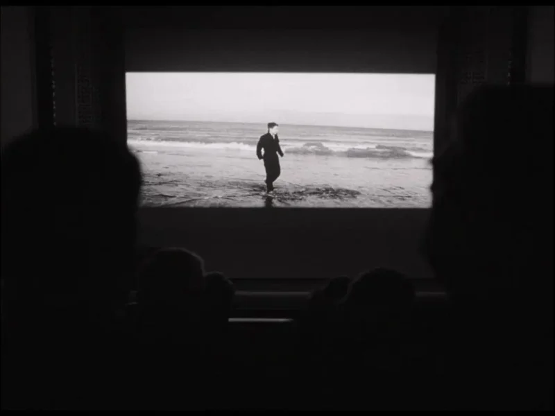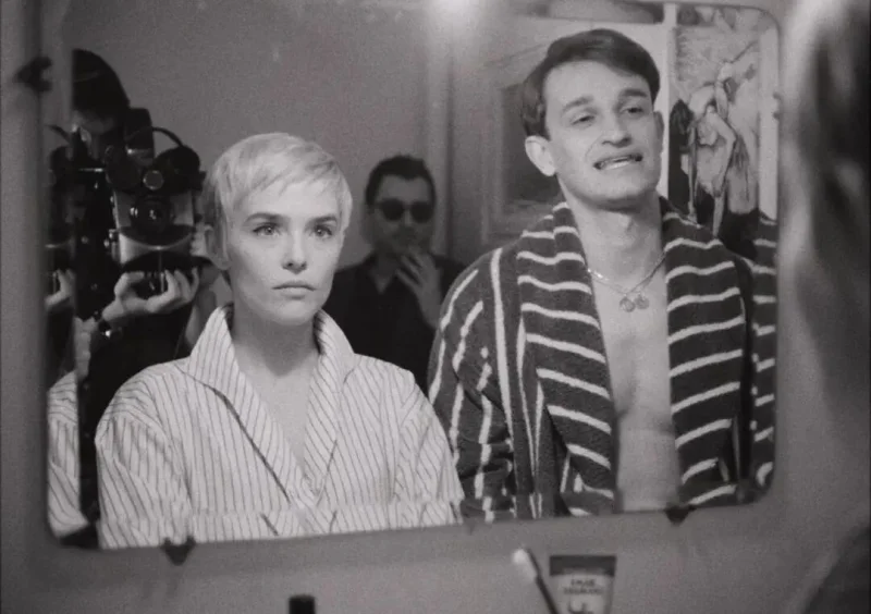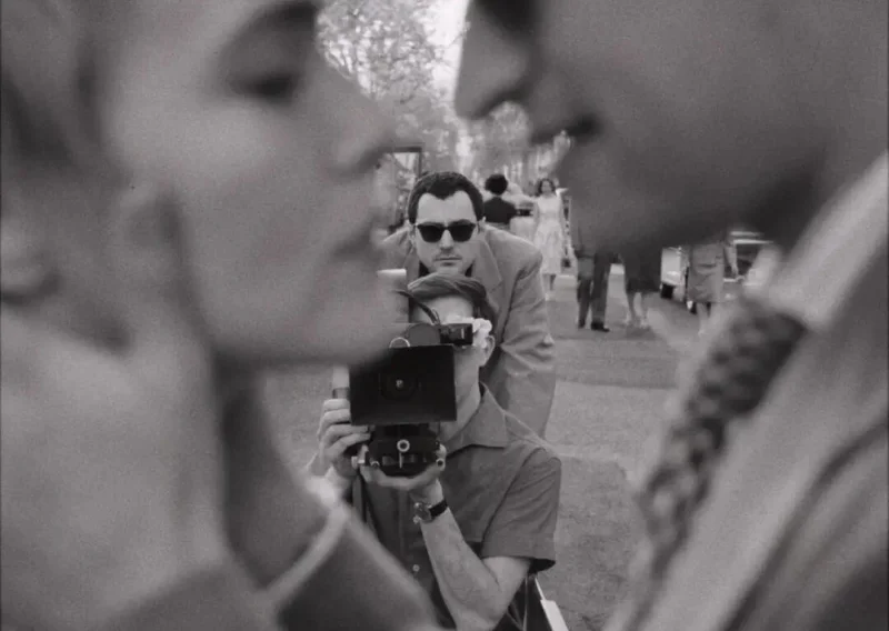 片场摄影师确实是那个试图忠实记录电影影像的人,但通过其他方式,并在时间(拍摄之后)和空间(其他角度)上存在错位。仿佛是为了呼应戈达尔的一句台词(“瞬间与意外,唯有我们才能做到”),林克莱特为名人与无名者绘制肖像——几秒钟的定格,直视镜头,并附上他们的名字——在每一个段落的开头引入一连串动人的新面孔,他们注视着我们,仿佛在向我们发出邀约。毫无疑问,正是本着同样的精神,在重现《精疲力尽》的拍摄时,林克莱特也字面意义上地“翻转”了他的摄影机:他让镜头与戈达尔及其摄影师拉乌尔·库塔尔的摄影机相对,对称地复制了那些场景,但却是在镜子的另一侧(当你在看完《新浪潮》后再看戈达尔的原作时,效果会变得惊人)。这些镜像拍摄以及静态肖像照,在视觉上引发了同样的感受:品味着认同感,与我们或多或少带有幻想的记忆重逢(这尤其令人愉悦),同时也惊叹于它们之间的差异,惊叹于它们在我们的迷影记忆与电影即时呈现的当下之间、在我们回顾性知识的坐标与意外发现之间所营造的张力。