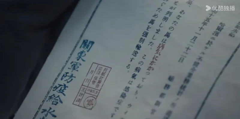 开篇二条被带走,日军为掩盖其将马匹用于细菌实验的真实目的,伪造了这份文件,声称“二条”得了“滤过性病毒”,需要“强制检疫”,从而合法地掠夺了百姓的财产并用于其反人类罪行。
