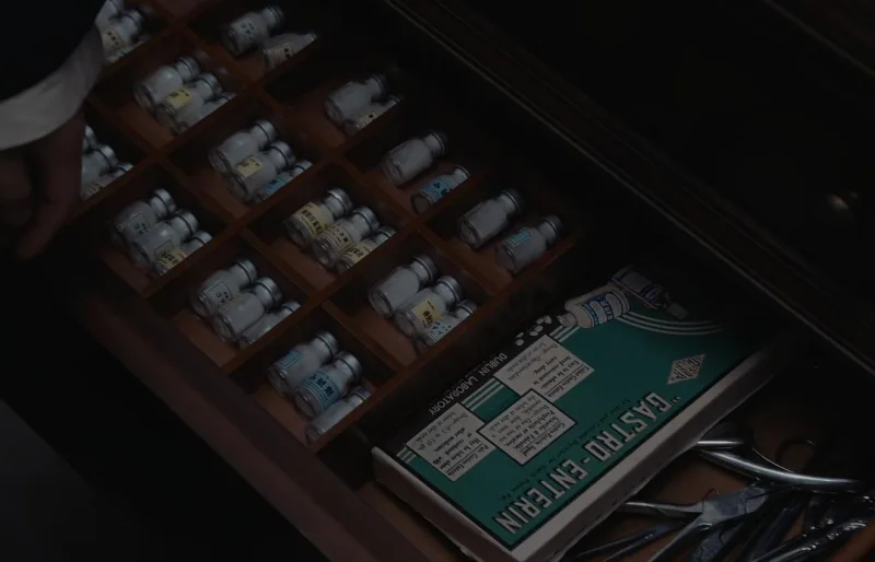 抽屉里的其他东西(安瓿瓶)依稀能辨认出日文片假名,有的看起来像奎宁,治疟疾的,盐酸类药物,通常是止痛或麻醉用。