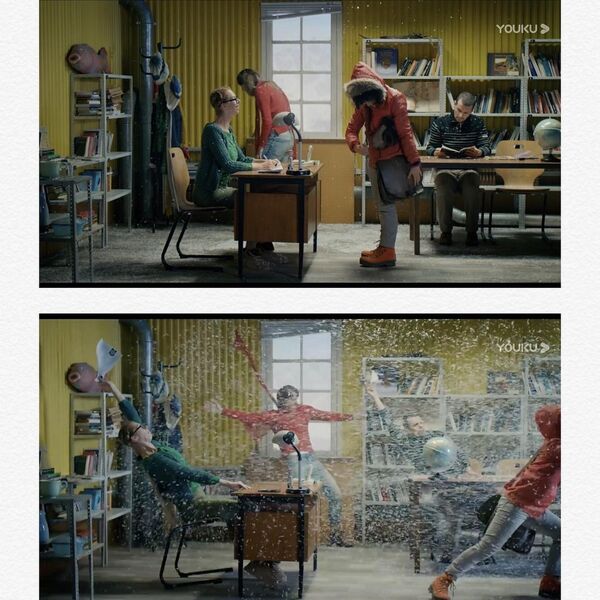一开门,明艳温暖的工作室,瞬间被夹带着雪花的寒风灌满,而被吹得衣襟凌乱的人们却反应淡定从容。戏剧的一幕既体现了加拿大人对冰雪天气的习以为常,也刻画了加拿大人处事不惊、温和从容的性格(据说是与加拿大社会福利优秀有关)。