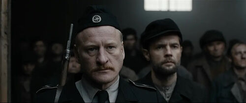 集中营里,毒死的犹太人遗留下来的行李箱堆积如山,等待被分门别类的区分和清理出来,归入德意志帝国,这种杀人掠财的强取豪夺让人毛骨悚然。纳粹军官瓦格纳拿起一摞上等皮质手套得意洋洋的说“我妈妈只在商店橱窗里见过这些,我们甚至不敢靠近,就怕打坏了什么东西,我发誓要把世上所有的宝贝,都送给我妈妈,过去我没有送,现在我要弥补这一切。”一句话泄露天机,战争前,这些纳粹军官很多是穷困潦倒的贫民,比如那位纳粹看守不自量夸耀“那些戒指适合我这样高贵的手上”,瓦格纳揭穿他“你哪里高贵,你不是和我兄弟在建筑工地干活吗?”一个犹太珠宝匠在一堆戒指中发现了他给妻子打造的那枚订婚戒指,惊恐的瞪大了眼睛,差点失神崩溃,这一幕被纳粹摄影师拍了下来,摄影师自豪的说“战后我要办个展览,你们都会嫉妒死”。集中营里纳粹的草菅人命让人不寒而栗,活着的犹太人一旦明白过来,立刻会陷入巨大的恐惧中,同是犹太人的苏联军官萨沙就不甘心这样像行尸走肉般排队等死,他要逃出去。