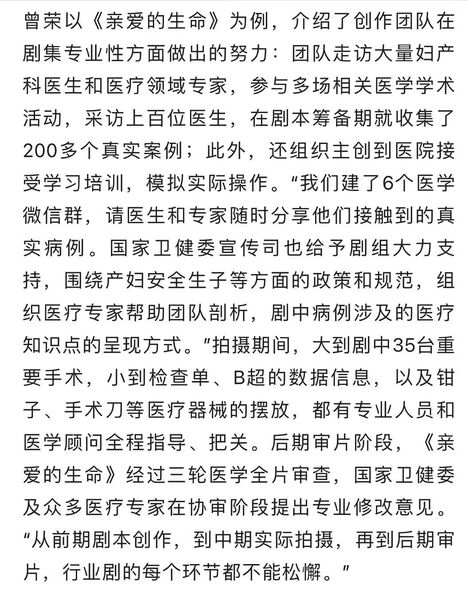 ——这剧以医疗为主,情感穿插其中,非常专业的妇产科工作气氛和场景,真实病例改编的病患故事(手术),非常贴近现实生活,微微虐(毕竟是医院里的故事),虐中带一丝甜,配上温暖的基调,显得虐甜适中。观看时感觉故事好看、隽永,回想时又觉得故事令人唏嘘不已、醇厚,回味无穷还不得不感叹现实人性的复杂。 大家想象一下,一个大医院(盛济医院)妇产科,每天病患医生,人来人往,繁忙得像高速运转不停的机器一样,但是那些忙碌的人们,ta们背后都有故事,各种各样的故事,悲欢离合,世间百态,酸甜苦辣,何止千种滋味。三、这剧优点很多,其中一个我觉得非常难得的是: 它娓娓道来一个又一个妇产科里的病例故事,却从不说教,不会武断的下结论,丝毫没有爹味,反而留给观众【很大的思辩空间】,让观众看到各类病患是什么态度,护士医生是什么观点,那么观众,你呢,你设身处地,你会怎么做?你的态度会如何? 所以,它不是催*生*剧,也不是恐*婚*恐*育剧,它就是呈现各种情况,让观众自己去考虑。四、这剧科普了很多医学知识(主要是产科方面)。 剧中工作场景和操作都非常专业化。一个接一个病例筛选自【200多个真实的妇产科病例】。 比如: 高龄孕产妇、巨大儿造成的肩难产、低龄孕妇、妊娠期高血压、妊娠期糖尿病、产后抑郁症、围产期抑郁症、妊娠剧吐、微笑抑郁症、自毁容貌综合征、妊娠合并肺动脉高压、慢性高血压合并重度子痫前期高龄孕妇…… 放心啦,这剧科普的方式,非常简单易懂,是讲故事的方式——病患住进妇产科,围绕她的故事就展开了。