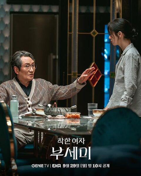 小金长了一张非韩剧主流女主的脸,冷硬厌世,对这个世界充满憎恶,这是贯穿她内心的黑洞,也是会长选择作为“契约伴侣”的特质,一个人处境恶劣生无可恋,就会孤注一掷背水一战。会长得了癌,但临死前还要复仇:他是豪门贵女的赘婿,本来是她手下的厂长,贵女丧偶后找了他,可惜结婚一年妻子车祸去世,剩下的继子继女跟他不对付,千方百计想害他,先害死了他的私生女,现在轮到他。他专卖拉面(原型类似“辛拉面”“农心拉面”老板辛春浩,而且还推得全球卖,估计是广告赞助商,所以财阀爱吃面条是广子直接镶嵌到情节里,编剧不容易啊),虽说靠了富女,但他经商有道使财富成倍增长,没有自己血脉还要被夺产,不,我要复仇——贾会长找了律师给女主订了条件苛刻的合同,要他替自己在三月后去董事会投票,顺带以她为饵,做局抓人,让继子继女们一毛钱拿不到,还要为之前的罪行买单,这是他部署到最后的计划。