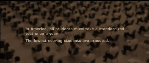 本片的设定是“在不远的未来,人类出现物资危机,联合国下令各个国家每年自减5%的人口,来解决这个问题。美国决定用考试的办法来决定谁死!小学生到高中毕业,每年的期末考试会将5%的后进学生消灭掉!”