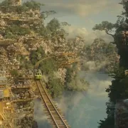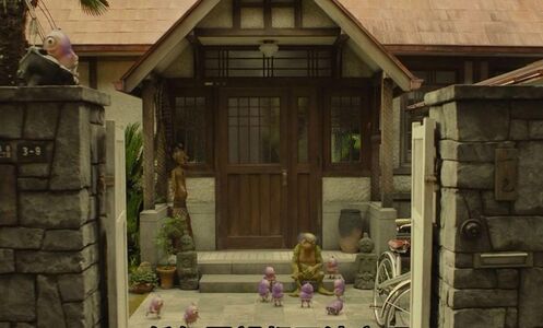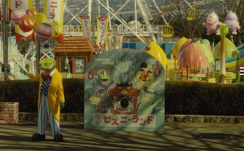 另外,在青蛙男卖气球的游乐园旁边的合影牌子上,蘑菇人的形象也出现了一小下。远处图右边空中粉红色的雕塑是独眼仔。