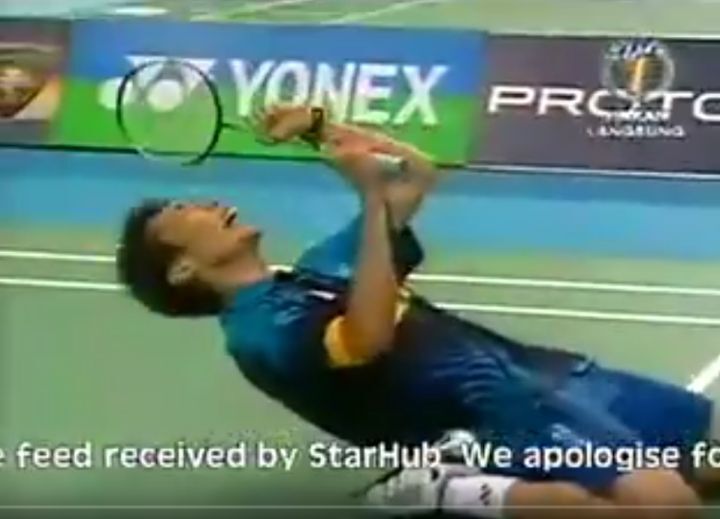 比赛赢下最后一分的李宗伟,欣喜若狂,跪倒在地上半身后仰贴地庆祝的经典画面: