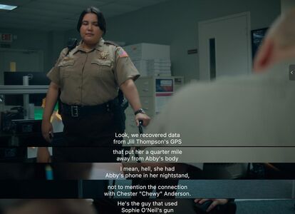 一个是刚开头,这里Flynn警探接到隔壁镇同事的电话,说发现了和Abby死亡现场匹配的枪支(Information for Gun Use)。E8后续知道了是被Margo弟弟卖给街头混混的,直接导致这集末尾Sophie变成头号嫌疑人被抓。