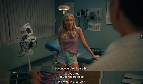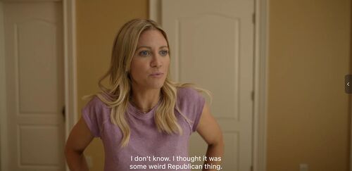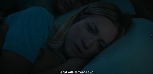 Sophie回家后和丈夫睡前聊天:我才不会和那些女人们做朋友,她们像Marjorie Taylor Greene的翻版……除了Margo。这里Sophie所说的对象Marjorie Taylor Greene也很好笑,是一位Republican女性议员,以传播阴谋论,擅长发表煽动性言论和行为粗鲁好斗而闻名。这里Sophie的吐槽的确带着东海岸精英的傲慢。然后丈夫马上开始了:你可以成为任何你想成为的人,这里没人认识你,也许你可以往前看了。Sophie无语说我只是在聊天而已,怎么又上纲上线了。累了睡觉吧。此处丈夫想发生关系但未果(再次感叹Graham真的好难看)。