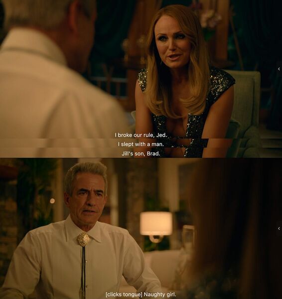 这一集我们用Jonny警长和Callie的Pegging来做开场。我觉得需要说明的是Jonny其实并不是gay,而直男喜欢Pegging的这个Sexual行为其实算是X癖的一种;不过这样的设计也很妙,作为得克萨斯州的警察局长,这几个字差不多是传统、权威、法律秩序和刻板男性气概的终极集合了。Jonny的公众形象是一个铁血硬汉,而私下则喜欢被妻子走后门。这种内外反差让这个角色更丰满讽刺了一点。同样也展示了Callie在这段关系中所占的主导权。