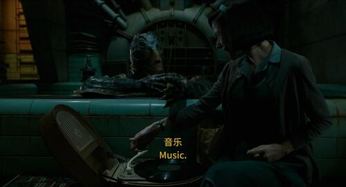 水是Elisa和鱼人结缘的契机,艺术推动他们关系的进展。他们关系的第一次推进,是Elisa在池边放一张唱片,比划着教鱼人单词“Music”,鱼人第一次露出笑容;第二次推进,是Elisa在空旷的电影院找到鱼人,他们默契对视,在荧幕背景下心意相通。当怪物具备人类的心智和审美,为什么还要称之为怪物?