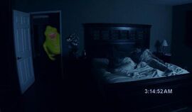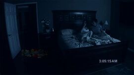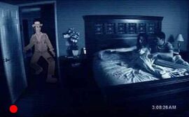 【第3个晚上】电影进行到22分钟,当摄像机再次对准男女主角的床和卧室门,然后“第三个夜晚”字幕出现时,观众就知道“要开始了”,神经开始紧绷。这22个恐怖段落几乎都是这样提前“警告”观众:吓人招数要使出来了。这对于一部恐怖片,特别是一部美国恐怖片来说,是绝对致命的。但是《鬼影实录》非常大胆也或许只是无奈这样做了,好在在“真实感”面前,再多的故弄玄虚都是没用的。第三个晚上之后,男女主角发现摄影内容能让他们知道在他们睡着时发生了什么,这同时也是电影海报的标语:What Happens When You Sleep。这个伎俩利用的是人的想象力,两眼一闭对未知环境的无穷猜想,就像很多人看了《咒怨》不敢半夜睁开眼一样,看了《鬼影实录》后我绝对不会想要用摄像机记录我睡觉时的卧室。