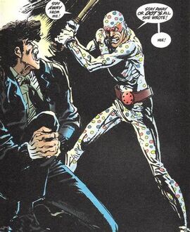 本名Abner Krill,来自哥谭的超能力罪犯。其科学家母亲沉迷超级英雄,所以从小就给自己孩子做实验,死的死伤的伤,Polka-Dot Man因此感染了一种长出彩色圆点和脓包的古怪皮肤病,他必须按时排出它们,否则会被从内部吞噬,他同时患有应激障碍,看谁都是他母亲的样子。漫画中他的斑点只存在于白色衣服上,只是一项先进科技,不同颜色的斑点可以发挥不同的用处,是哥谭市中的小恶棍。