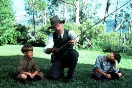 显然,这位父亲并没有把他的法则当作是最高的甚至唯一的范本(是范本,因为作为神父他不足以认为自己能替代上帝的权威,但他却完全可以如很多教士一样声称自己的领会是最好的范本,毫无疑问,那所谓“最好的范本”有一个别样的称呼,叫做“教条 ”)。他也是这样教两个孩子钓鱼的:他拿出一个摇晃的钟摆,让两个孩子按照音乐中四拍的节奏去甩动长长的鱼线。(没有看过这部影片或者没有钓鱼经验的人或许不知道其意义何在,我曾有幸跟随后来的“父亲”,我的丈人,学习过钓鱼,他虽然没有影片中的父亲那样诗意,但也确实曾教会我如何将鱼线抛得更远。在我看来,站在乡间河边的我同影片中站在大河边的诺曼,并没有多少的分别,而且当我这样想的时候,我很高兴我又有了一位“父亲”。)影片中的父亲就以这样一种既刻板却也优美的方式,一种寓自由于规则的方式,教会两个孩子钓鱼。