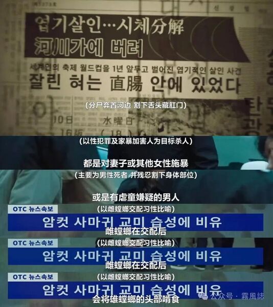 有一点不能忽略——“螳螂”连环杀人案的受害者都是犯过重罪的男人,不能视作单纯的变态,比起快乐型杀人更接近清道夫类型,颇有以暴制暴的意味,尤其割舌、断头等极端毁损尸体的行为透出对男性的复仇、厌恶情绪。