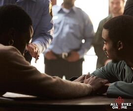 当然,《all eyez on me》之中将2pac赋予了更多的内涵,甚至于将2pac上升到了一个精神领袖的层面,只是电影十分不厚道的,顺道着还将此时还没有和2pac有任何恩怨,甚至于二人还有些惺惺相惜的东海岸说唱大佬BIG踩了一脚,而将BIG讽刺为一个没有理想抱负,只是希望“都能来买我的唱片”的戴着versace定制镶金墨镜的追逐利益之人了。