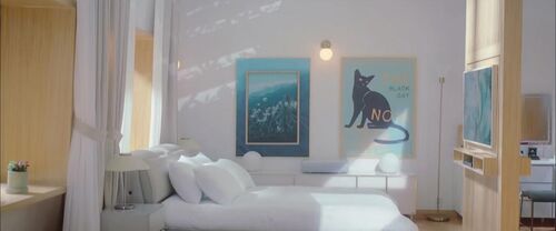 说到无脚鸟当然是《阿飞正传》里的张国荣了,从画作上也可以看出是在致敬《阿飞正传》的场景,无脚鸟在森林上空一直飞翔着,因为没有脚,所以无法停下来休息。“你害怕安定,你对于付出灵魂的关系感到害怕。”重点来了,黑猫对多情的象征意义:“你把它放在别人而不是自己更容易看到的地方,可以解释为你想要或者在寻找的是像黑猫一样的人,在爱伦坡的小说中黑猫被杀了之后又复活,即使被困在墙里还是不停哀鸣举发犯人,代表你把情感高度投射在被害人身上。”不过这个画面中,黑猫画下面就是床,说明多她自己也很常看着它,更可以解释她本身对与黑猫一样救援者的强烈需求。不用说,男主英道就是救她的“黑猫”了,不如《你是我的春天》改叫《你是我的黑猫》~“被杀又回来,被困在墙里还是不停哀鸣举发犯人”的命运,估计就是后面等待着他的剧情了。他的童年创伤还没有交代、又被反社会人格男二盯上了,还有一直追查的犯人······从《那个男人的记忆法》到这部剧,看来他要一直在危险中恋爱了~
