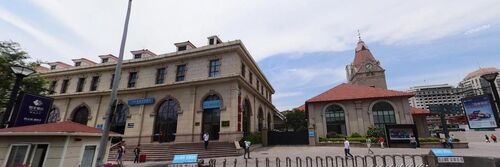 火车站是由德国人魏尔勒和格德尔茨设计,由山东铁道公司施工的。当时的火车站主要由钟楼和候车大厅两大部分组成,北联一层办公用房,建筑具有德国文艺复兴建筑风格。候车大厅以高大的装饰山墙和三个大型券门突出了面向市区的主入口,楼南角耸起一座造型优美的尖钟塔,正居于广西路和兰山路的轴线上,成为兰山路对景。火车站成为胶济铁路的终点站,并成为青岛的景观建筑之一。 [2]