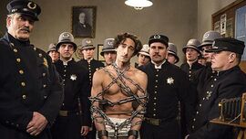 就比如迷你剧里,有一个场景是这样的:胡迪尼第一回表演他著名的“中国水牢(Chinese Water Torture Cell)”。在这个表演的结尾,观众看到胡迪尼半天没能逃脱出来,于是大声呼唤工作人员冲上去砸开水箱,把人救出来。于是一个身穿消防队员服装的人冲了上来,手里拎着把斧头。可等来到水箱面前,这个人却没有真的抡起斧头砸向水箱,反而是转过身来,对观众微笑致意。