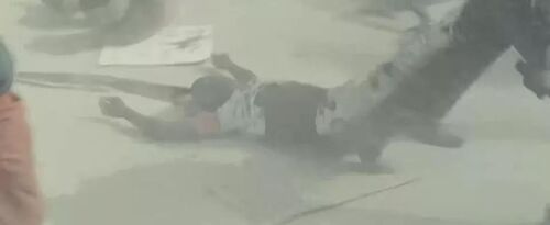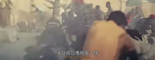 镜头透过浓浓的烟雾记录了束手无策的平民被暴打的场景,广播声音放着:“家人像朋友一样,朋友像家人一样。”画面却放着男人被拖行留下的一道血痕、女人捧着一只鞋绝望痛哭······