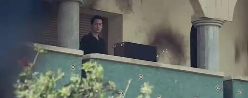而此时在大使馆内的参赞仍是孤立于战争的旁观者状态,他在高处亲眼目睹了暴行,镜头拉近,烟雾散开,他震惊的表情暗示着这一场危机从此刻开始,不再与他无关。