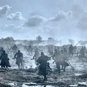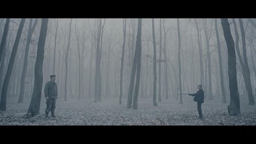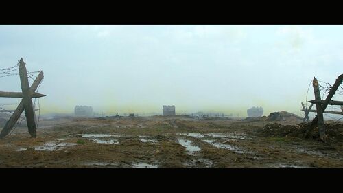 爱德华·贝尔格当然没有这样的天才手笔,但总算有自知之明,在技术尝试浅尝辄止后,他转回到自己还算擅长的景片模式。影片最开始的几个静照:远山、树林、狼穴、仰拍的树冠、俯拍的战场(以及最后垂直而下的推镜)已经预先阐明了他的作业习惯,他的特色在于静态构图,其后果就是将基于个体经验的动态视觉转向了一种客观经验的环境视觉。