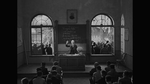 以学校鼓动学生参军的一场戏来说,1930年的版本融合了教室内景和后面街道的士兵游行,教师的鼓动和学生的躁动,使用了一种双重纵向的推镜,一直抵达精神外化的大特写,这是表现主义的遗产;但新《西线》的操作是学校大厅里枯燥的横向摇镜,以及实用主义的景别切换,这里环境的自我封闭以及垂直方向上的不连贯性无法产生一种像前者那样有效的说服体验。