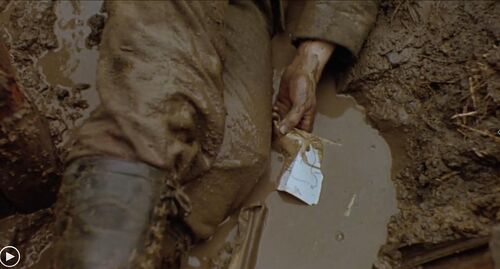 这一如索姆河战争的段落,在鲍曼用匕首刺伤那位法国大兵的时候,雷马克描述的是一种复杂的情绪:鲍曼希望自己落难时候也能得到法国人的救护,这种心情让他选择了拯救。这段戏在1930版中持续了两天两夜,他的头顶是不断跨过的法国大兵,是燃烧弹的不断升落。而在新《西线》中,这段戏只持续了很短的事件,人们只看到法国大兵的吐出的血水与鲍曼脸上沾满的泥。