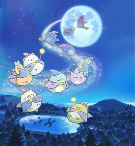 とある秋の日、キャンプに出かけて行ったすみっコたち。空を見上げると、いつもより大きく青く輝く月が。  「5年に1度おとずれる、青い大満月の夜。  魔法使いたちが町にやってきて、夢を叶えてくれる」  伝説のとおり、すみっコたちの町に魔法使いの5人きょうだいが舞い下りてきた!  公園、スーパーマーケット、森の中。  次々と魔法がかけられ、キラキラに彩られた町はまるでパーティー会場のよう。  やがて楽しい夜に終わりが近づき、月へ帰っていく魔法使いたち。  そこにはなぜか…たぴおかの姿が!?すえっコの“ふぁいぶ”と間違えて連れていかれてしまって…?