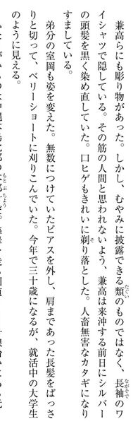 大家哄笑过后,室岡看向兼高,兼高几不可见地摇了摇头,于是,这件事被当做笑话一笑了之。室岡听了兼高的话,他忍下了。
