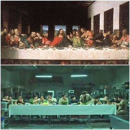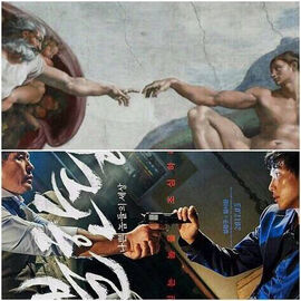 第一张是经典的最后晚餐,尽管十二门徒仿佛明示背叛的戏份,也是大多数人对主题的理解,但仔细看宰浩是上帝,贤秀却不是那个背叛者犹大,他并没有在这幅图里。