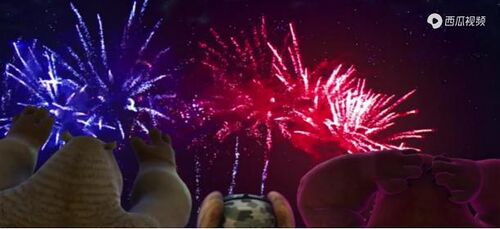 动画的结尾,一人俩熊坐在火车货仓里看烟花。