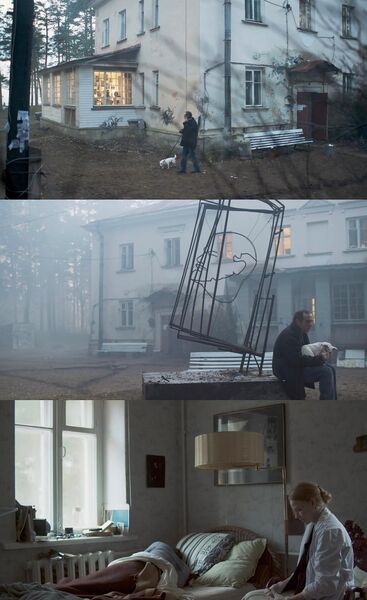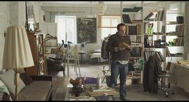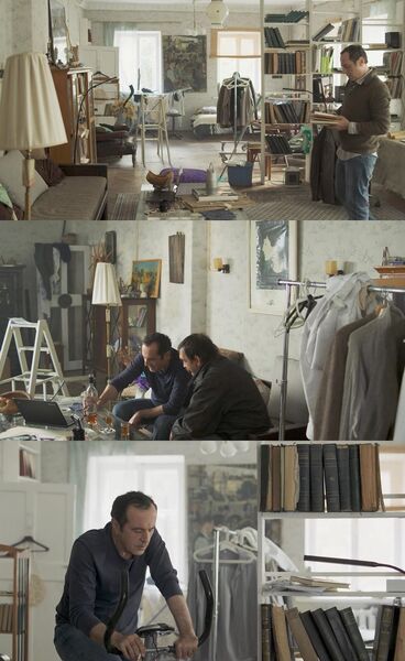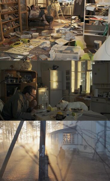 我特别喜欢这部电影的美术。从设定上来讲,不完全是单一场景也差不多了,教授房间的设计我实在是喜欢。他会在房间里进行除了吃饭睡觉以外的其他生活,包括书法(写中文)运动办公等等,加上门口的铁丝雕塑,在这些功能性中又不失美感,也随着时间展示主角的心境,在这个方面是成功的。故事视觉化不如《电子云层下》,但对于故事的讲述上我反而更喜欢这一部。