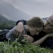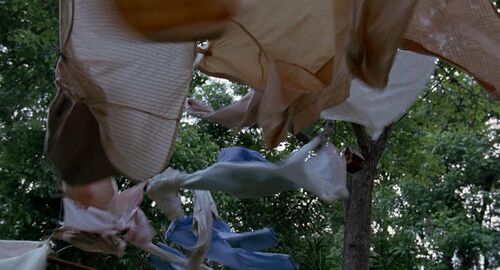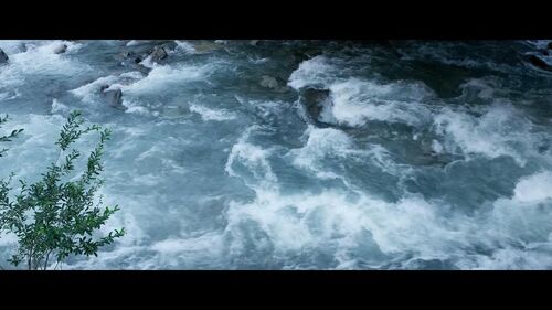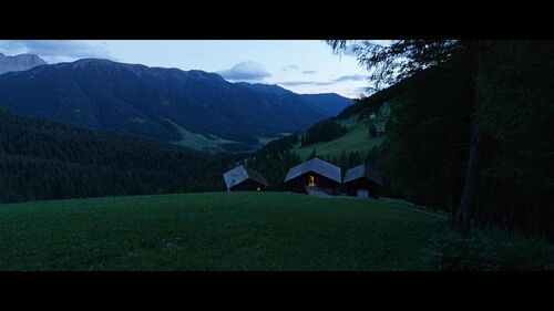 这个镜头出现在电影5分37秒处。在上一个镜头中,我们已经看到Franz和Fani结束了一天的劳作,正在回家的路上,而这就是他们的家了。在进入这个镜头时,我们似乎可以感到音乐有了一定程度的加强,因为与它产生情绪共鸣的元素得到了展现:我们可以同时听到风声,风铃声和炉火的噼啪声。马力克在此忽略了这三种声音在空间上共存的不可能性:风声来自外部,而风铃和炉火的声音却只有在房子内部或是房子附近才能同时听到;这个镜头却是一个大远景镜头,我们从远处看到这些小小的房屋。尽管如此,这个镜头似乎还是在我们身上引起一种情感的震颤。这一震颤来自于哪里呢? 我们虽然没有靠近房屋,但是隐约透露的火光已经暗示了炉火的存在。这一暗示显然并不足以勾起足够的感知,于是马力克贴心地加上了炉火的噼啪声——这一背景音清晰地提示了炉火的存在,或者说是把我们潜意识中对这一存在的认知钩到了表层,于是我们的脑海里出现了浮动的火光以及火的热度——火的形象成型了。火,人类千万年崇拜的图腾,一种对安居的原始向往。 而风——我们不仅可以听到它的声音,更从风铃的响声感到它的存在。这里的风铃声不但是家宅的象征,也是对风之实体的勾勒。于是,我们感受到了风的厚度。 当我们想象一个安居的场所的形象时,往往出现在我们的脑海中的就是这样一副图景:一座小屋,处于自然的环抱中,仅是一个外部的形象而无需内部肌理的填充。元素的原始观念在这个镜头中得到复兴:气(风)、火(炉火)、土(山谷在此仅仅作了视觉上的展现——或者说,由山风已经足够呈现一个完整的山谷的形象),而水的形象也在稍后得到展示。在这个镜头中,马力克展现出一种对原始经验的追溯,他用一幅牧歌式的图景唤起了我们对安居的向往。