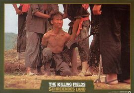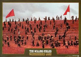 影片中,红色高棉进入金边城时,前政府军和市民打出了白旗,弥望的是“一片降幡出石头”,整个街道似乎笼罩在一片胜利和祥和的氛围下。潘迪忘乎所以地跳入人群大呼:“和平了!和平了!”然而胜利从来只属于胜利者,并不属于虚幻的所谓“人民”。没多久,潘迪和三个外国记者就在医院里发现了血的真相。但是已经迟了,红色高棉领导人波尔布特以战备为借口把所有民众驱逐出城,并实行“农业乌托邦”计划。那一片片白旗是一块块裹尸布,将苦难的柬埔寨人民送往死地。